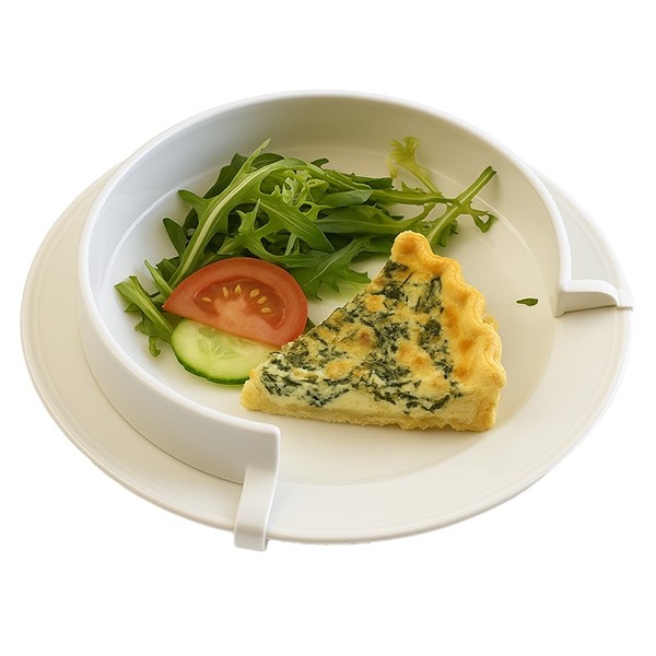 Son bord élevé empêche la nourriture de tomber hors de l’assiette et agit, grâce à son aspect incurvé, comme une butée qui permet au patient de collecter les aliments plus facilement, minimisant ainsi le gaspillage et la frustration gustative qui peuvent, à terme, le fatiguer, voire le décourager de manger. De forme circulaire, le rebord assiette incurvé dispose d’une large ouverture pour faciliter la mise en bouche, tandis que son fond est légèrement courbé pour épouser idéalement le creux de l’assiette et éviter ainsi tout débordement ou fuite.