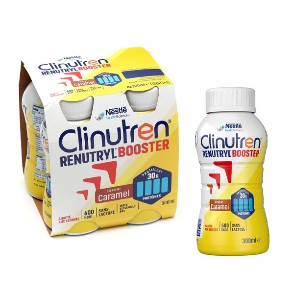 Clinutren Renutryl Booster saveur caramel est une boisson hypercalorique et hyperprotéinée spécialement indiquée pour lutter contre la perte d’appétit et de poids des personnes fragiles (escarres ou cancers,par exemple, car les besoins nutritionnels sont augmentés dans le cadre de ces pathologies) ou âgées. Il permet d'enrayer le phénomène de la dénutrition. Cet état pathologique, qui survient lorsque les besoins de l'organisme ne sont pas couverts par les apports, peut avoir des conséquences graves.