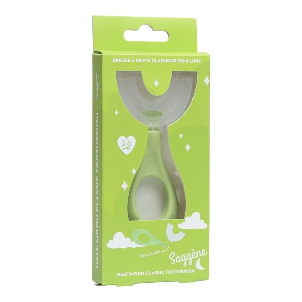 La brosse à dents classique demi-lune Sagyène est un dispositif d'hygiène ingénieux qui permet le brossage efficace et complet des dents des enfants âgés entre 2 à 6 ans. Il facilite le geste des parents, mais autorise également un usage en autonomie de l'enfant sans aucun risque de mauvaise manipulation. C'est l'accessoire indispensable à toute bonne salle de bain.