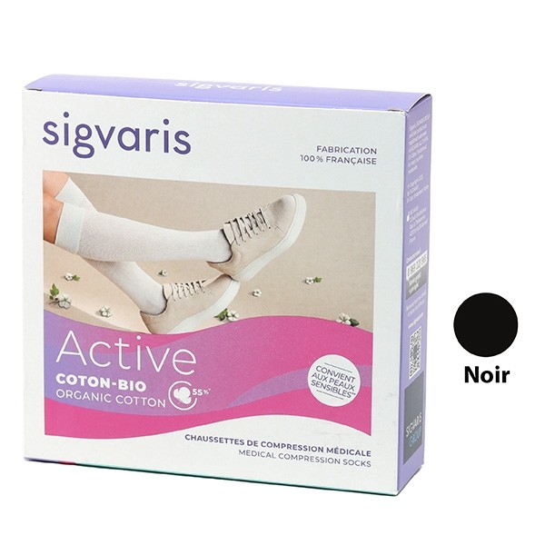 Les chaussettes de contention Active Coton bio Sigvaris de classe 2 pour femme ont été créées pour faciliter le retour veineux tout en apportant un confort maximal au quotidien aux pieds sensibles. En effet, ces chaussettes de contention Sigvaris contiennent 55 % de fibres de coton bio afin d'offrir une excellente tolérance cutanée aux peaux sensibles. Outre leur moelleux et leur confort remarquables, les chaussettes de contention Active coton bio facilitent l'évacuation de l'humidité, pour une sensation de confort accrue tout au long de la journée. L'association unique de leurs fibres va exercer une compression médicale de classe 2 (15 à 20 mmHg), de la cheville en remontant le long du mollet, afin de faciliter le retour veineux et soulager la sensation de jambes lourdes. Avec les chaussettes de contention Active Coton bio de Sigvaris, vous vous sentez bien dans vos jambes toute la journée ! Et pour vous offrir encore plus de confort, ces chaussettes de contention en coton bio Sigvaris sont faciles à enfiler ; la zone du pied est élargie et la pointe de pied, sans couture.