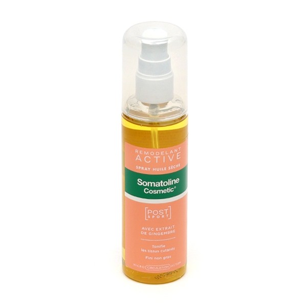 L'huile sèche Remodelant Active de Somatoline Cosmetic est un spray raffermissant qui s'utilise après une séance de sport dans le but de tonifier les tissus cutanés et favoriser leur drainage. Elle contient de l'extrait de gingembre et de l'huile d'argan, combinaison idéale à la préservation de l'hydratation de la peau et au renforcement de son élasticité. Des tests cliniques, effectués par la marque, évoquent une augmentation de près de 73,3% au bout de 4 semaines d'utilisation.