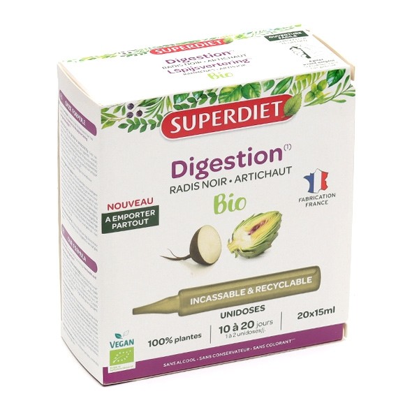 Super Diet Radis noir Artichaut bio unidoses est un complément alimentaire à base de radis noir et d'artichaut bio, pour la digestion¹, sous forme d'unidoses incassables & recyclables, à emporter partout et à ouverture facile.