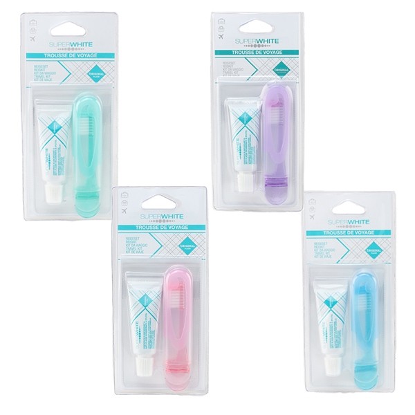 La trousse de voyage Superwhite original contient une brosse à dents pliable, un tube de dentifrice et un étui souple.