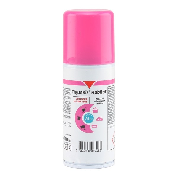 Il se présente sous la forme d'un petit aérosol de type fogger, qu'il suffit d'actionner dans votre intérieur pour déclencher la diffusion automatique. Il est proposé en format 100 ml, pour couvrir jusqu'à 24 m². Avec le diffuseur automatique Tiquanis Habitat, vous pouvez enfin débarrasser votre intérieur de tous ces parasites !