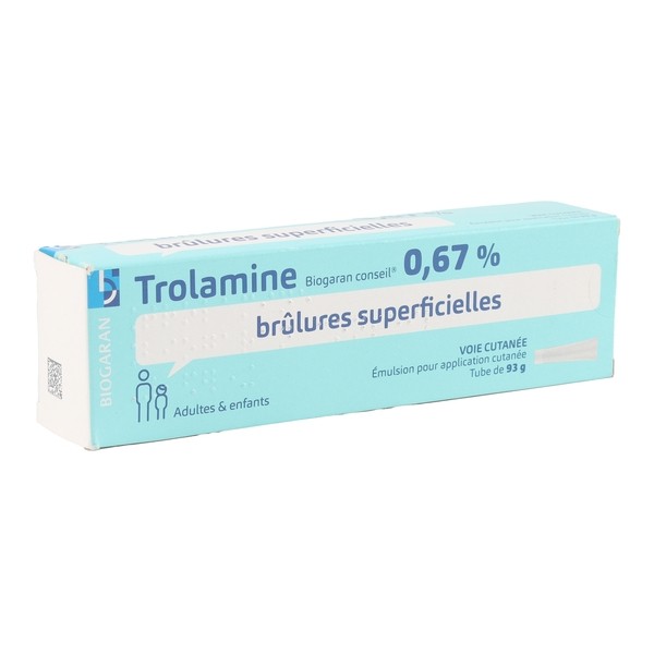 Trolamine 0,67% émulsion Biogaran est un médicament qui fait partie de ce que l'on appelle les protecteurs cutanés. Cette émulsion est indiquée dans le traitement des brûlures superficielles et peu étendues, ce qui inclut les coups de soleil localisés. Elle est aussi indiquée dans le traitement des plaies cutanées non infectées.