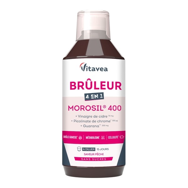 Vitavea Morosil 400 Brûleur 4 en 1 solution buvable est un complément alimentaire avec édulcorant, sous forme de solution buvable à diluer, saveur pêche, sans sucres.
