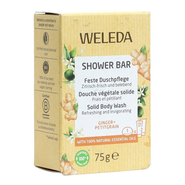 Formulée avec un parfum issu d'huiles essentielles naturelles, cette douche solide associe les notes épicées du gingembre aux accords frais, toniques et pétillants du petit grain, pour une expérience sensorielle vivifiante et stimulante. Par ailleurs, sa formule biodégradable et son étui en carton recyclable en font une alternative écologique aux gels douche liquides traditionnels. Avec sa texture et son format solide, ce savon pour le corps Weleda équivaut à deux flacons de 150 ml, pour une utilisation longue durée et un impact réduit sur l’environnement.