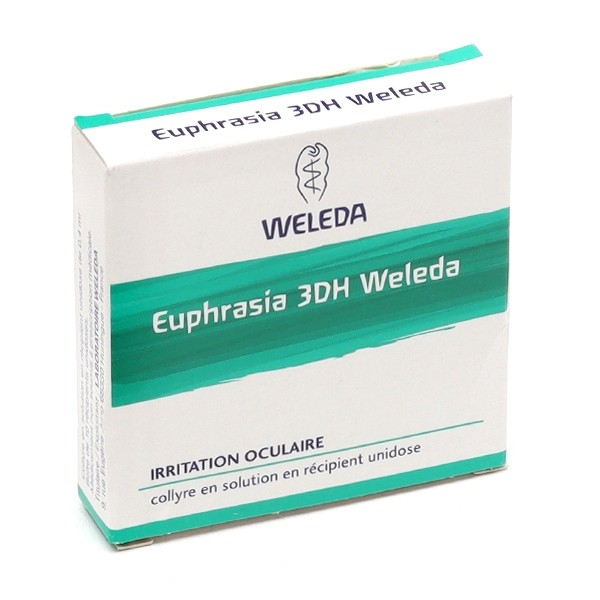 Le médicament Euphrasia 3DH Weleda, collyre en solution en récipient unidose est un collyre apaisant homéopathique traditionnellement utilisé dans les irritations de l’œil ou en cas de gène oculaire avec rougeur ou larmoiement, sensation de brûlure, d'origine allergique ou physique, à la suite d'une fatigue ou d'un surmenage oculaire (travail sur écran, jeux vidéo, télévision…), d'un bain en piscine ou en eau de mer ou encore suite à une exposition au vent, pollens, atmosphère polluée, fumée, poussière…