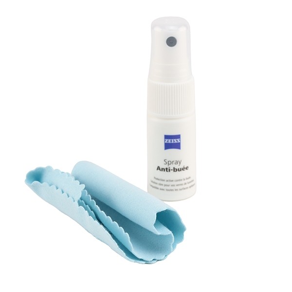 La buée qui voile vos verres de lunettes vous exaspère ? Le kit anti-buée de Zeiss offre jusqu'à 72 heures de protection ! Il comprend deux éléments : un spray avec lequel vaporiser le verre et une microfibre qui va servir à bien répartir le produit.